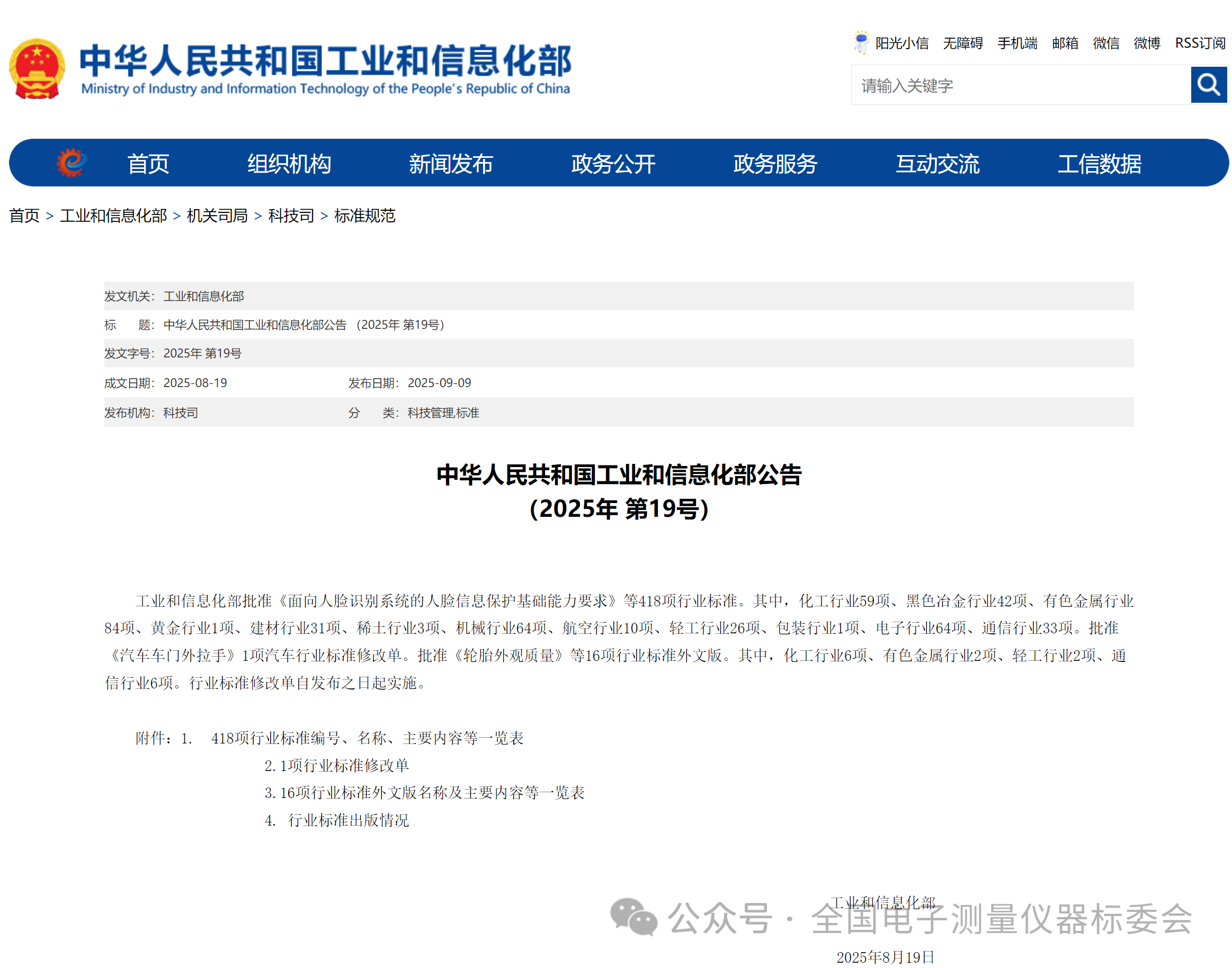 根據(jù)中華人民共和國工業(yè)和信息化部公告(2025年 第19號),由全國電子測量儀器標(biāo)準(zhǔn)化技術(shù)委員會歸口的《鋰電池芯短路測試儀》(標(biāo)準(zhǔn)號:SJ/T 10230-2025)《電子紅外額溫計(jì)通用規(guī)范》(標(biāo)準(zhǔn)號:SJ/T 10231-2025)等2項(xiàng)電子行業(yè)標(biāo)準(zhǔn)正式發(fā)布。